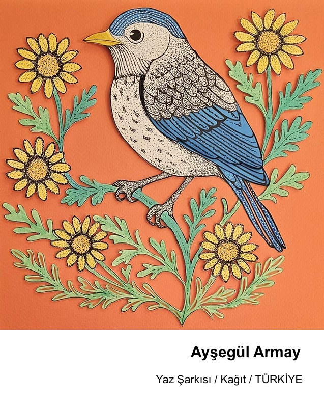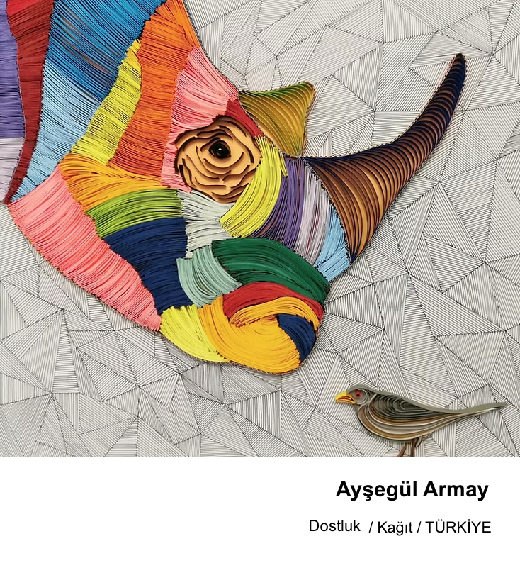 13. Hayvan Temalı yarışmada Türkiye’den 2 mansiyon kazanan Ayşegül Armay’ın sanatsal pratiğinin merkezinde kâğıt yer alıyor. Sanatçı, çok katmanlı kâğıt kesme, kolaj ve quilling tekniklerini bir araya getirerek yüzey ile hacim arasında etkileşim kuran kompozisyonlar üretiyor. Katmanların üst üste gelmesiyle oluşan ritim ve derinlik, Ayşegül Armay’ın çalışmalarına hem heykelsi hem de mimari bir karakter kazandırıyor.