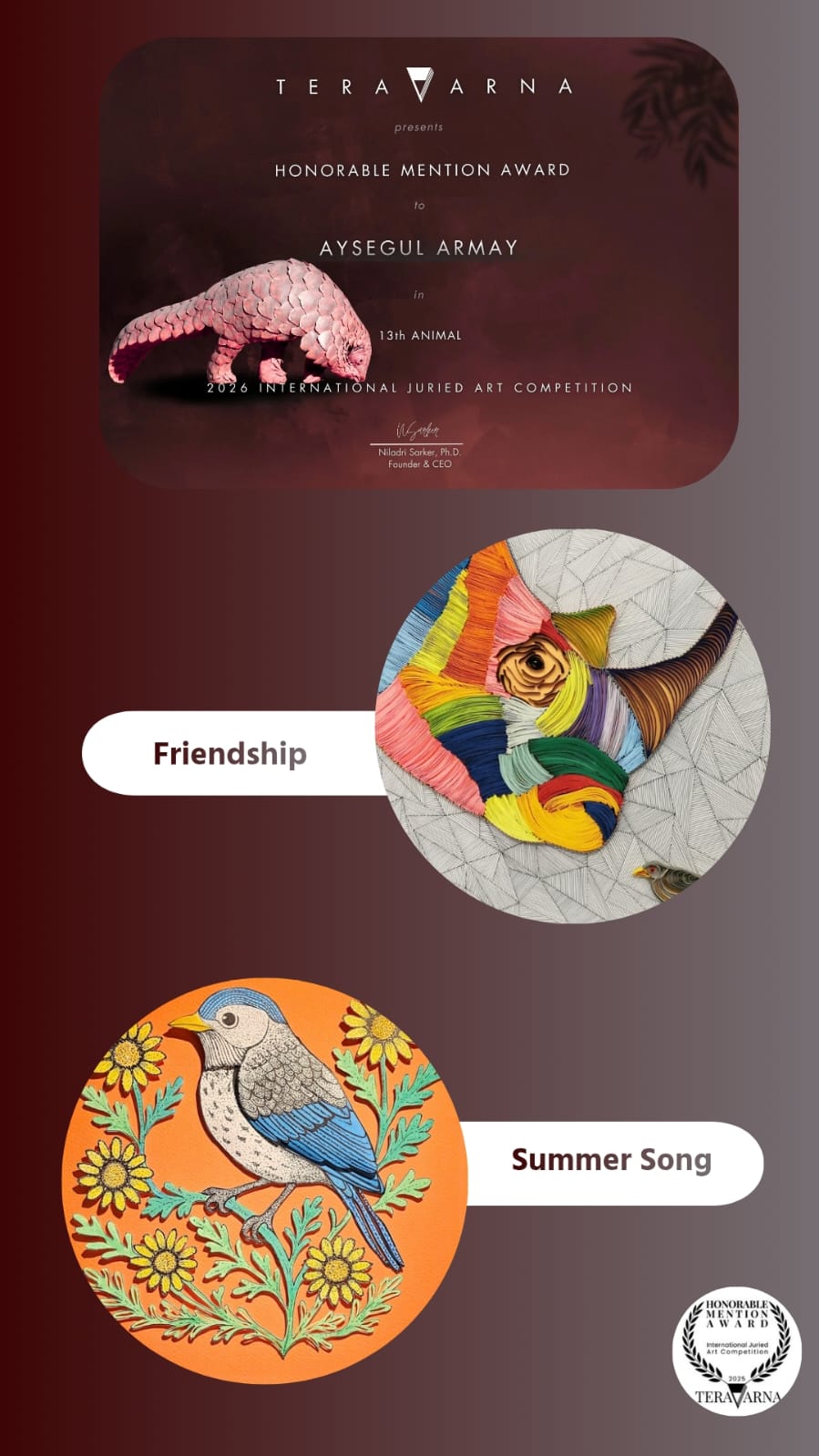 Ayşegül Armay, Mart 2026’da yapılan Uluslararası Jüri Seçmeli Sanat Yarışması’nda Hayvan Kategorisinde 2 mansiyon aldı. Uluslararası Art Show Internatıonal Gallery TERAVARNA‘nın 13. Hayvan Temalı Jüri Seçmeli Sanat Yarışması‘nın sonuçları açıklandı.
